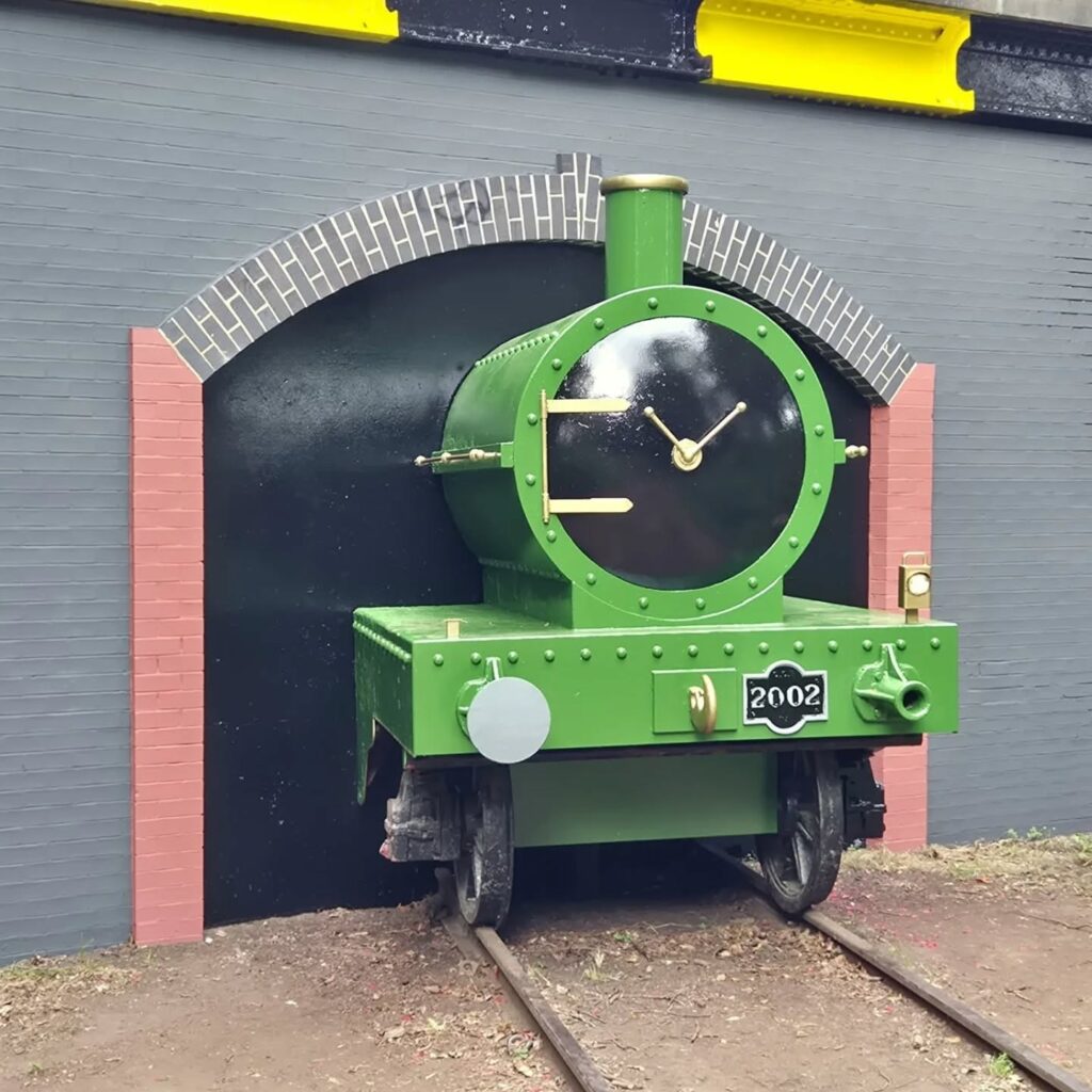 A photograph of the restored train sculpture in Woodthorpe Park, at the road bridge of Woodthorpe Drive.
