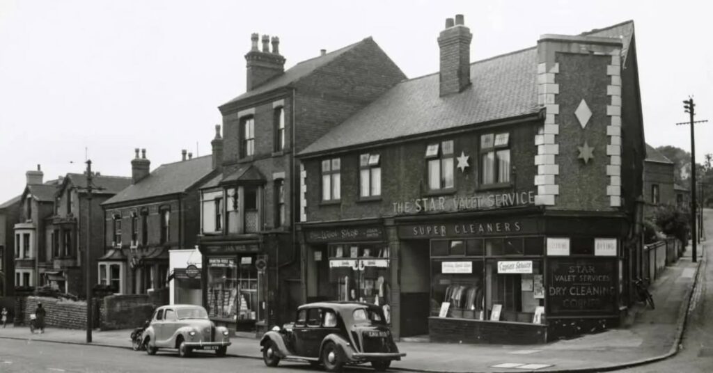 The Star Super Valet Cleaners (still known as Geoff Blore’s Bookshop) has a Wine Shop next door. This was long before Brigitte Bordeaux arrived. Their building is visible but it’s unclear what business operated there. Does anyone know? On the left is a post war Austin A40 Devon and on the right a 1939 Austin 12.